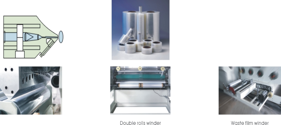 共擠纏繞膜機組以LLDPE(線型低密度聚乙烯)為主要原料,采用幾種不同牌號的樹脂,通過擠出機 擠出而生產出具有自粘性的單面粘或雙面粘拉伸纏繞膜,該膜具有較高的拉伸強度、抗穿 刺能力及耐沖擊性。纏繞膜具有良好的回縮記憶及自粘性,能使貨物緊裹成一個整體,防 止運輸時閃落倒塌及灰塵污染,并且該膜還具有優良的透明度和延伸性,能使包裝物品美 觀大方,經濟實用。可廣泛用于大宗貨物的集裝化托盤包裝,是運輸中用熱收縮包裝膜較 好的替代產品。